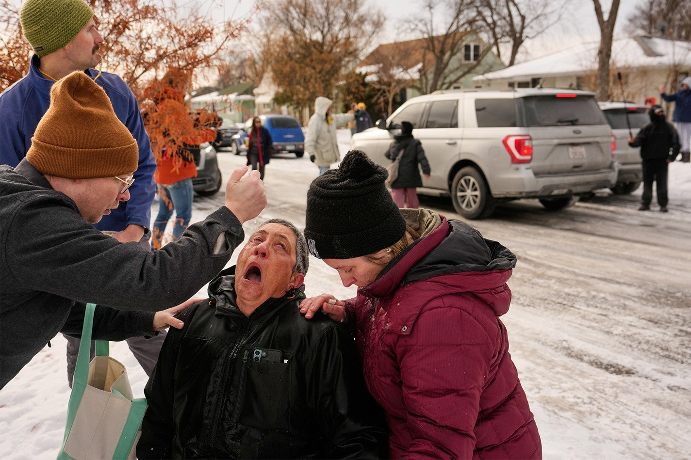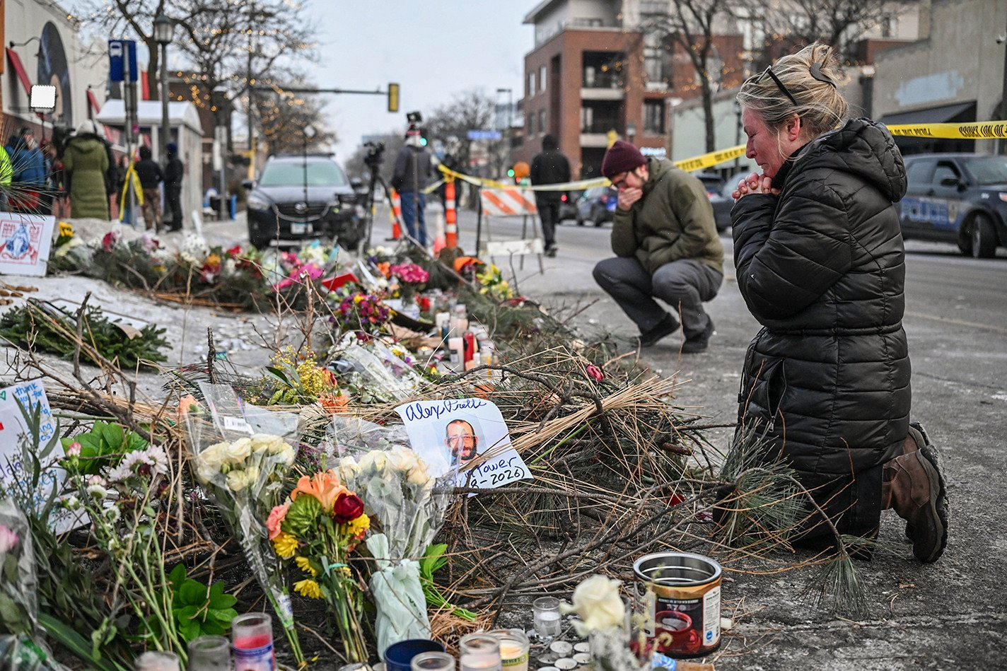 哀悼者聚集在为普雷蒂搭建的临时纪念碑周围。尽管气温降至零下,仍有数千名当地人聚集在一起,抗议“大都会突击行动”。