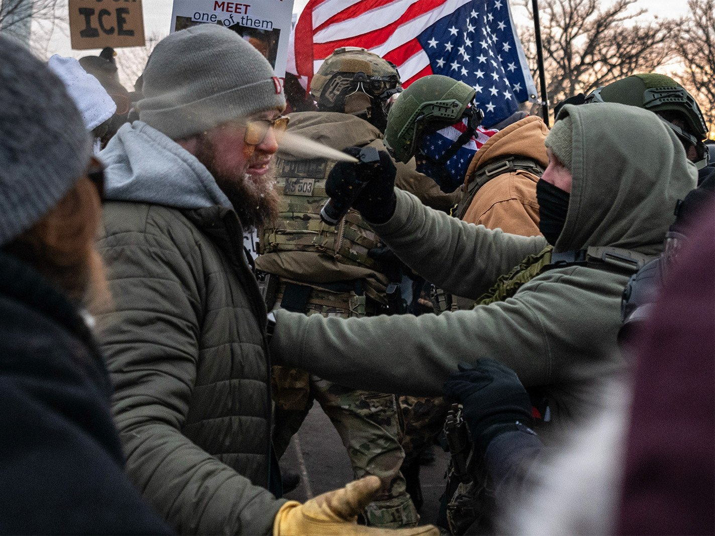 一名联邦执法人员向一名抗议者喷射胡椒喷雾,该男子正在抗议一场由杰克·兰发起的支持移民海关执法局(ICE)的集会。杰克·兰是一名右翼网红,曾因参与2021年冲击国会大厦事件获得特朗普总统的赦免。