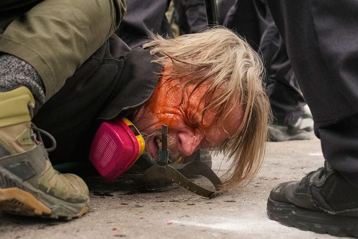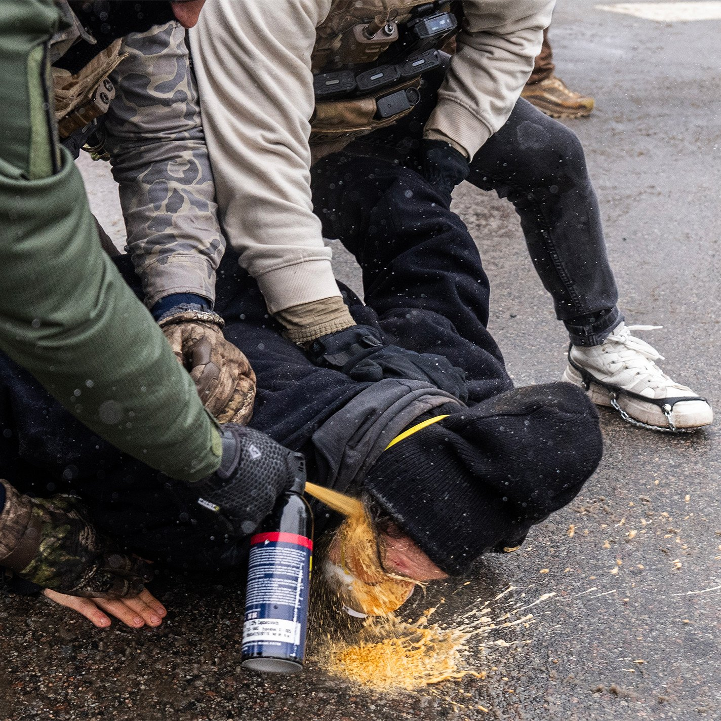 移民海关执法局(ICE)执法人员将一名抗议者按在地上,并直接向其面部喷射化学刺激剂。